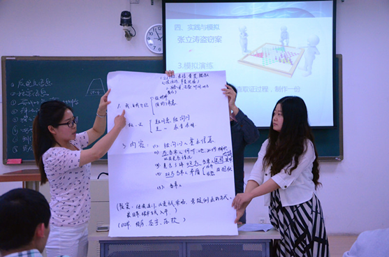 上午的诊所教学观摩包括刑事诊所和民事诊所,授课主题分别为调查取证与法律文书写作,四个公开课堂分别由冀祥德教授、常铮律师、张克锋律师、陈根发教授,分别在教学楼120、116、121和113教室同时开展授课,向来访院校充分展示了诊所互动式教学的特色与鲜明效果。以冀祥德教授担任主讲的刑事诊所班观摩课堂为例,诊所学员被分为四个小组,诊所课程分为知识讲授、互动讨论、实践与模拟、评价与总结四部分进行,以激发学生“像律师一样思考”和实践演练为主,以知识讲授为辅,气氛活跃、详略有致。整个过程中,两位老师积极引导,同学们主动思考、积极实践,发现问题、分析问题并解决问题。冀老师在课程总结时谈到,让学生成为课堂的主人,是诊所教育的特色之一;法律诊所的教学目的旨在培养学生向法律人一样思考,只有智慧与思维的碰撞,才能产生有价值的思想,才能培养具有主动性和实践能力的专业型法律人才。来访老师观摩得认真细致,并表示收获颇丰。