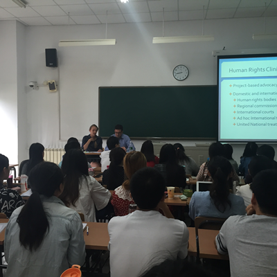 Alexandra Tate博士随后与同学们分享了芝加哥大学人权法律诊所参与办理的两个案例:一个是美国国内的Jessica Lenahan v. United States案件,涉及到美国国内人权救济程序的复杂与决议难以执行的问题。另一个是印度贫民居住权的项目。讲座中两位主讲人以美国法学院课程提问的方式与同学们热烈互动,就对案例及人权法的理解及相关问题进行问答并交流各自的观点和看法。