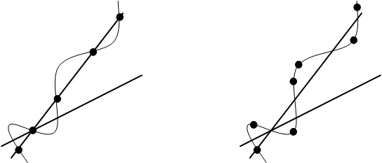 如下图,黑点表示的是数据,左边是没有噪声的数据,故在其轨道上,右边是有噪声的数据,故脱离轨道。