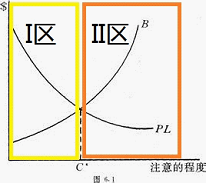 再次,由图可知,在I区时,PL>B;在C*上时,PL=B;在II区时,PL<B。通过前面,我们知道,当PL>B时说明设置一项预防设施的成本小于预期风险造成的损失,说明此种情形是经济的;当PL<B时说明设置一项预防设施的成本大于预期风险造成的损失,说明此种情形是不经济的;通过上图我们可知当PL=B时,设置一项预防设施的成本等于预期风险造成的损失。