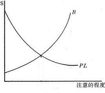 首先,我们设计两个函数,函数f(x)=B,函数g(x)=LP,其中B为“注意成本”,L为“损失额度”、P为“损失发生概率”。经验告诉我们,越注意避免风险,越要付出更多的注意成本,所以函数f(x)=B,“注意的程度”和“注意成本”呈正相关,该函数指“致害者预防未来事故的成本”;同理,经验告诉我们,随着注意程度提高,风险带来的损失越小,所以函数g(x)=LP,“注意的程度”和“损失额”呈负相关,该函数指“预期事故的可能性乘预期事故损失”。