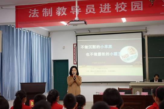 随后,受聘担任东风小学法制指导员的李萍律师借此机会,给来参加仪式的东风小学学生带来了一场反校园欺凌的主题讲座。李萍律师结合视频、案例、歌曲等多种形式,更结合自己亲身经历过的事情,生动形象地为同学们讲述了何为校园欺凌,如何应对和预防校园欺凌;并结合新实施的民法总则,告诉同学们应该怎样保护自己的权益。在讲解的同时,李萍律师与志愿者翁双杭穿插了大量互动环节,充分调动同学们的积极性,同学们纷纷主动举手发言,反响热烈。