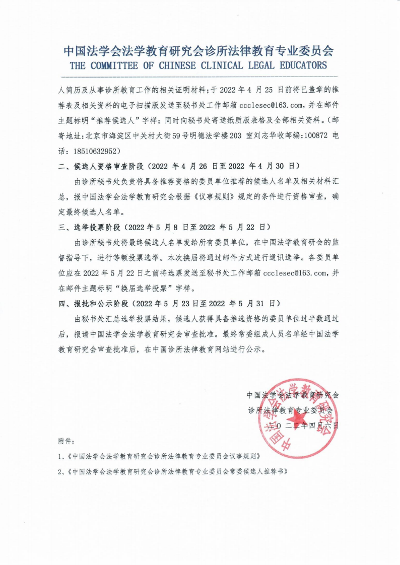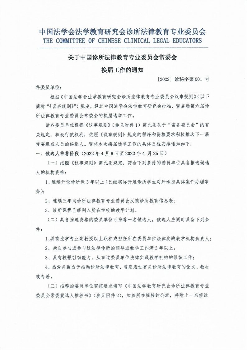 关于中国诊所法律教育专业委员会常委会换届工作的通知