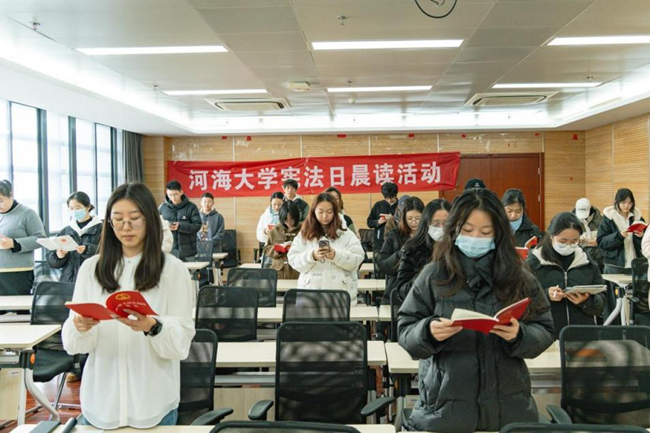 12月4日上午,河海大学法律援助中心、南京市江宁区法润法律服务中心在河海大学江宁校区行政楼902成功举办了国家宪法日“宪法晨读”活动。