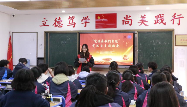 3.在常州市金坛区金沙高级中学开展“宪法在身边”主题班会活动