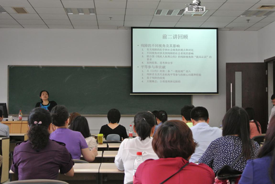 下午的活动主要是人民大学诊所课程观摩与交流。首先,与会教师来到人民大学残障权益保护诊所课堂上旁听课程并交流心得。残障权益保护诊所由哈佛大学法学院残障事业发展项目中国部主任崔凤鸣女士和我院教师、哈佛大学法学院残障人项目研究员郭锐老师共同执教,本节课围绕残障人学校、社区和社会融合的重要议题,由崔老师主讲。崔老师介绍了三位致力于中国残障事业的嘉宾,他们本身也是残障人士,在研究、传媒、志工等领域各有建树。崔老师回顾了前三堂课的内容,并请学生就上一次的课后作业进行汇报。先后有三位同学发言,围绕着“对共同教育的反对言论及对它的反驳”的议题,从人的观念、经费支持、师资力量这三个不同的视角展开。他们讲明论点,列明论据,引用大量数据,并给出针对性的意见。每位同学发言完毕,崔老师进行及时总结和补充。三位嘉宾受到同学们报告的触动,以个人经历或前沿研究为视角发言,扩展了大家对此议题的思考。在座不少老师对“共同教育”不甚了解,但听了这一堂节奏紧凑、内容充实、思想活跃的课之后,不少老师受到了启发,在课间休息时与崔凤鸣老师进行交流。