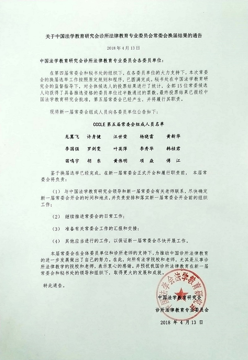 关于中国诊所法律教育专业委员会常委会换届结果的通知